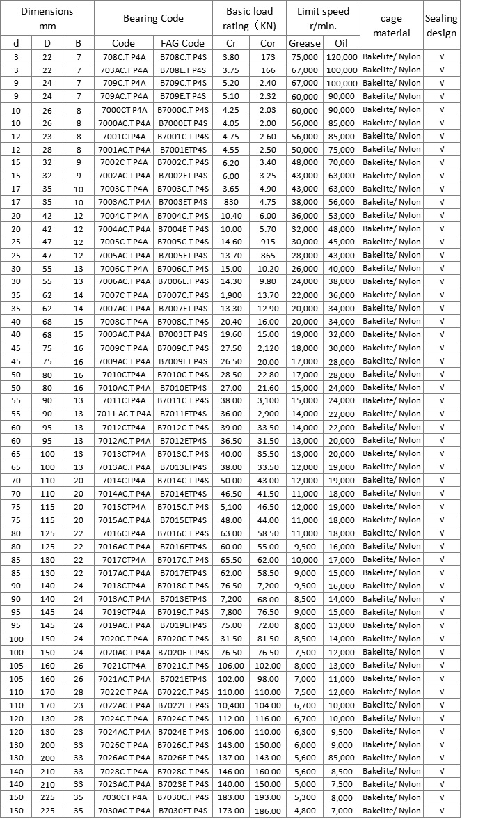 The spindle bearing is a kind of special design of single row angular contact bearings, its contact angle, tolerance, and cage structure is different from the ordinary bearing, especially used in where high precision and high speed required. The main applications of such bearings are the spindle of the machine tool and the motorized spindle of engraving machine. Precision spindle bearing includes precision Angle contact ball bearing 70 series, 72 series, 719 series.