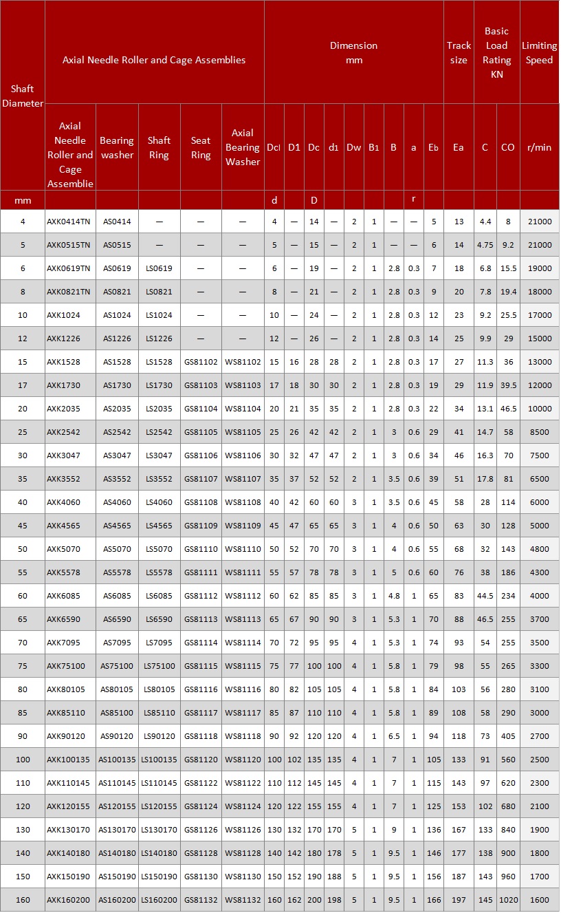 Axial needle roller and cage assemblies AXK, and AS LS GS WS washers.